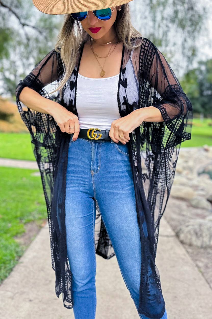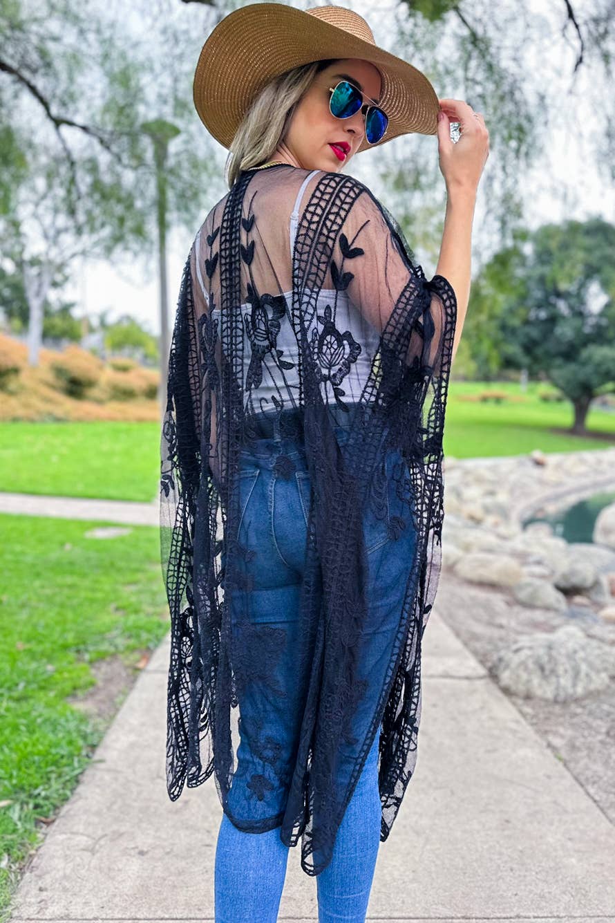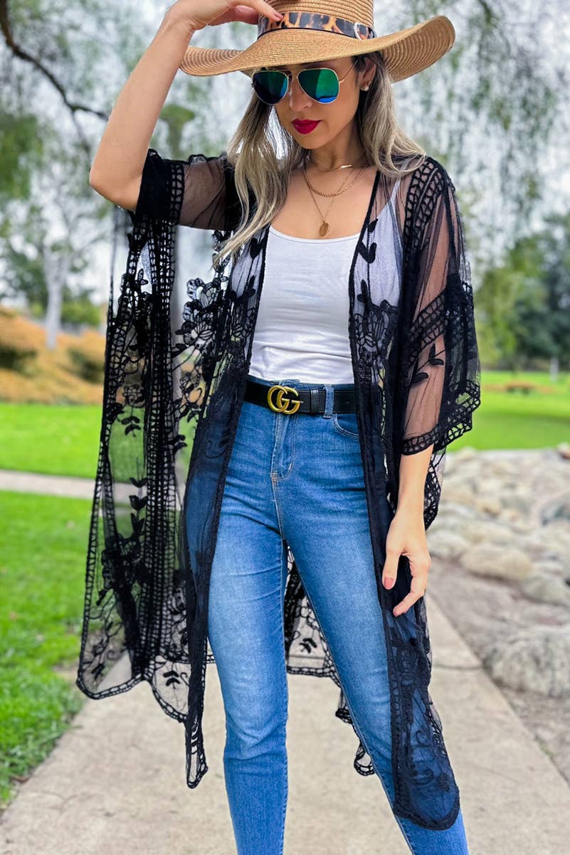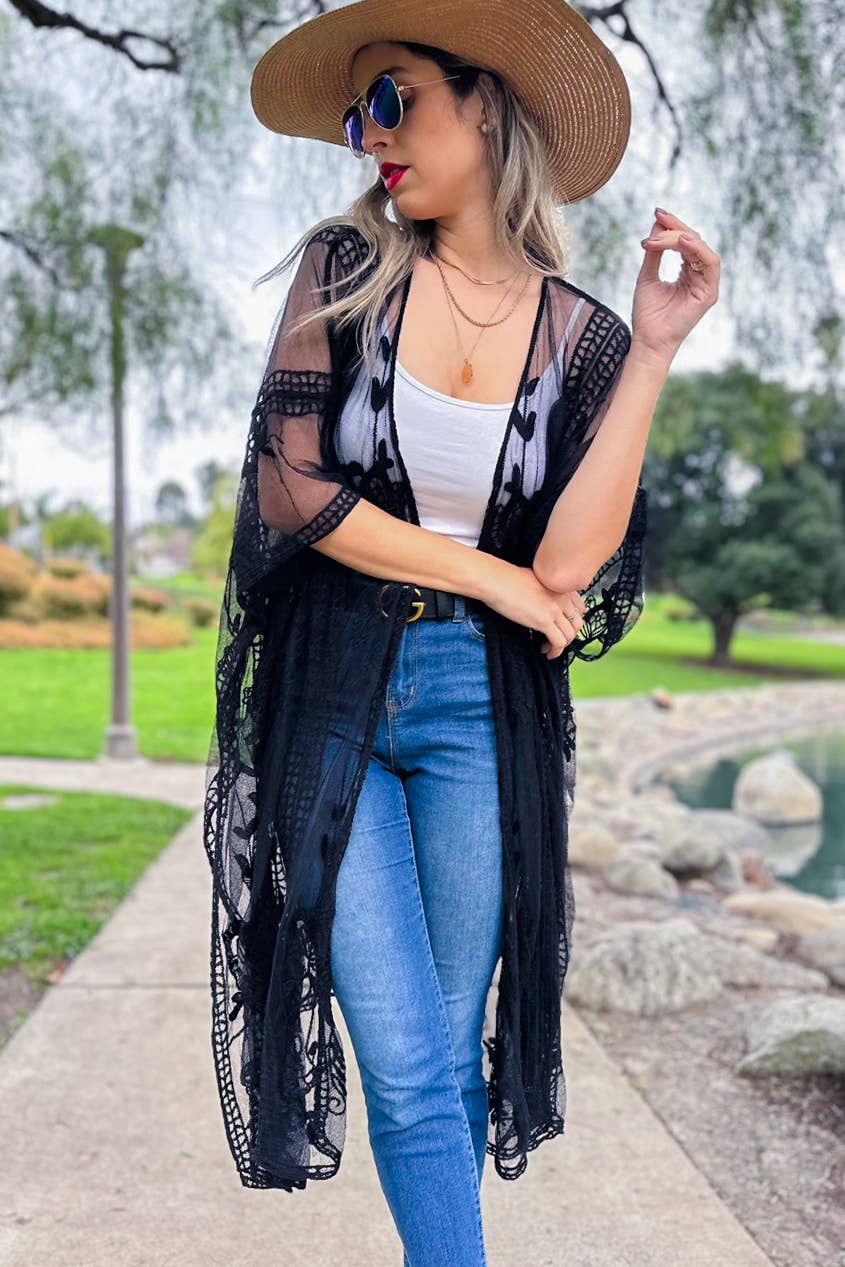 Add a playful layer to your outfit with this Black Floral Lace Kimono! Perfect for dressy occasions, it features sheer lace and fits most sizes up to 1XL. Embrace your fun side with this versatile cover up.