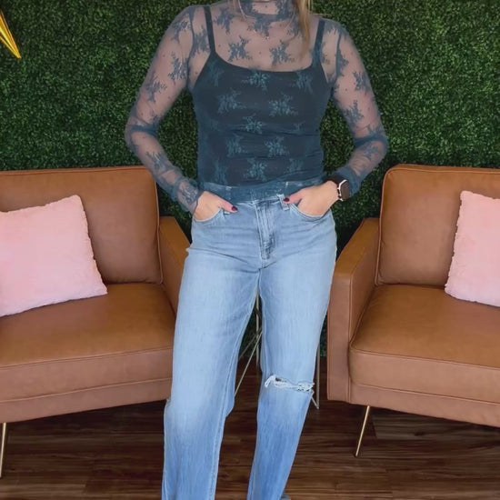 These high-rise distressed wide-leg jeans blend comfort and style with their stretchy denim fabric. Featuring a 10" rise, 32" inseam, and an 18" leg opening, they deliver a flattering slim-wide fit. Complete with trendy distressed details and full length, these jeans are perfect for adding effortless cool to your look. Model stands 5'10" and wears size 26.