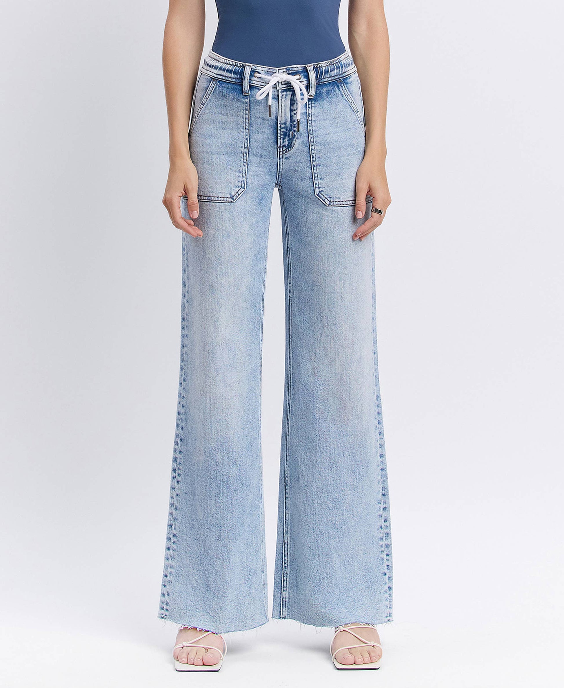 Step into comfort with these high-rise wide-leg jeans featuring a playful drawstring waistband. Crafted from stretch denim, they offer a relaxed fit with utility pockets and a trendy raw hem. Full length with a 10" rise, 32" inseam, and a roomy 23" leg opening, they're perfect for a casual, laid-back look. Our 5'9" model rocks a size 26!