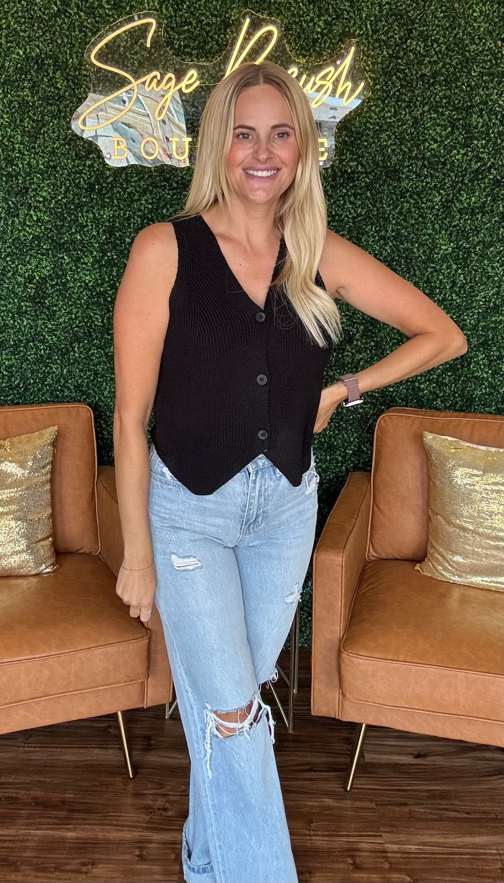 This playful ladies' vest combines cozy polyester and acrylic with a stretchy sweater feel. It features a solid color design, a flattering V-neck, and buttons down the front for easy wear. Perfect for layering with a fun twist!