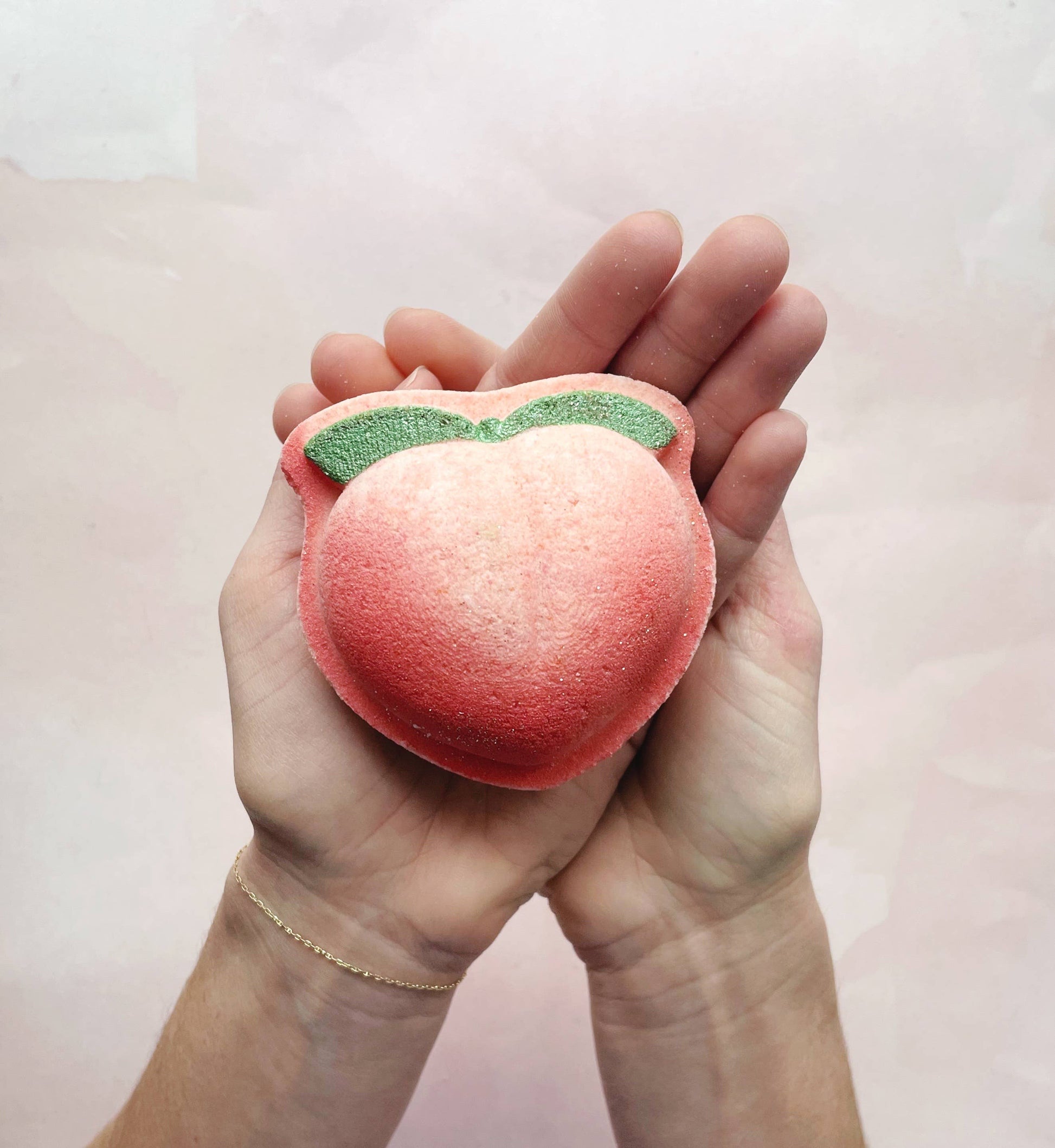 Sweet as a peach! This large peach is filled with fun colors and smells like sweet, fruity, sugar! Ingredients: Baking soda, citric acid, kaolin clay, cream of tartar, epsom salt, powdered buttermilk, sweet almond oil, coconut oil, slsa, poly80, mica, hot pink colorant, f.o., eco glitter.