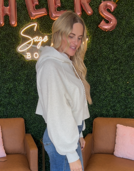 This cropped hoodie features a raw hem and dolman sleeves for a fun, relaxed vibe. With balloon sleeves ending in snug cuffs, it blends cozy comfort with sporty style. Perfect for a laid-back yet chic look, it fits loosely and is modeled by someone 5'8" wearing size S.