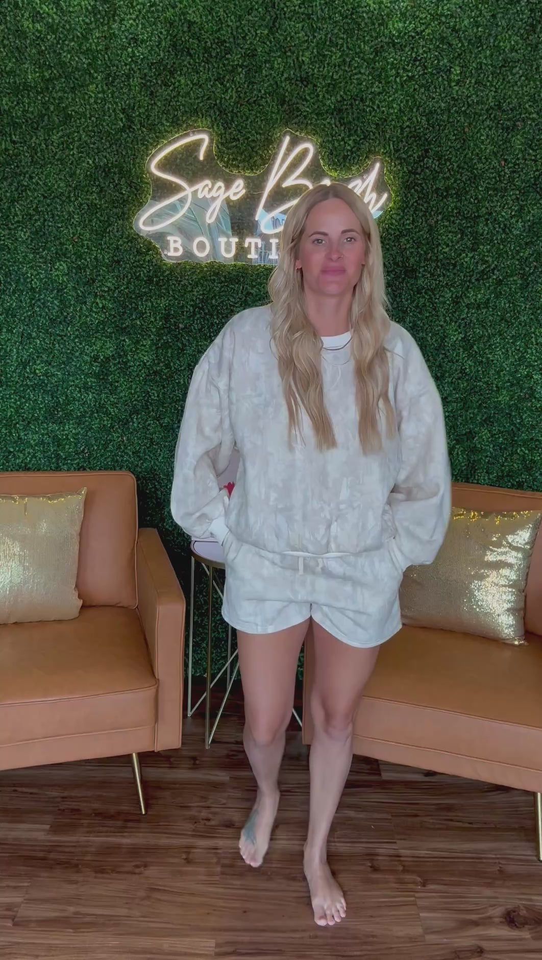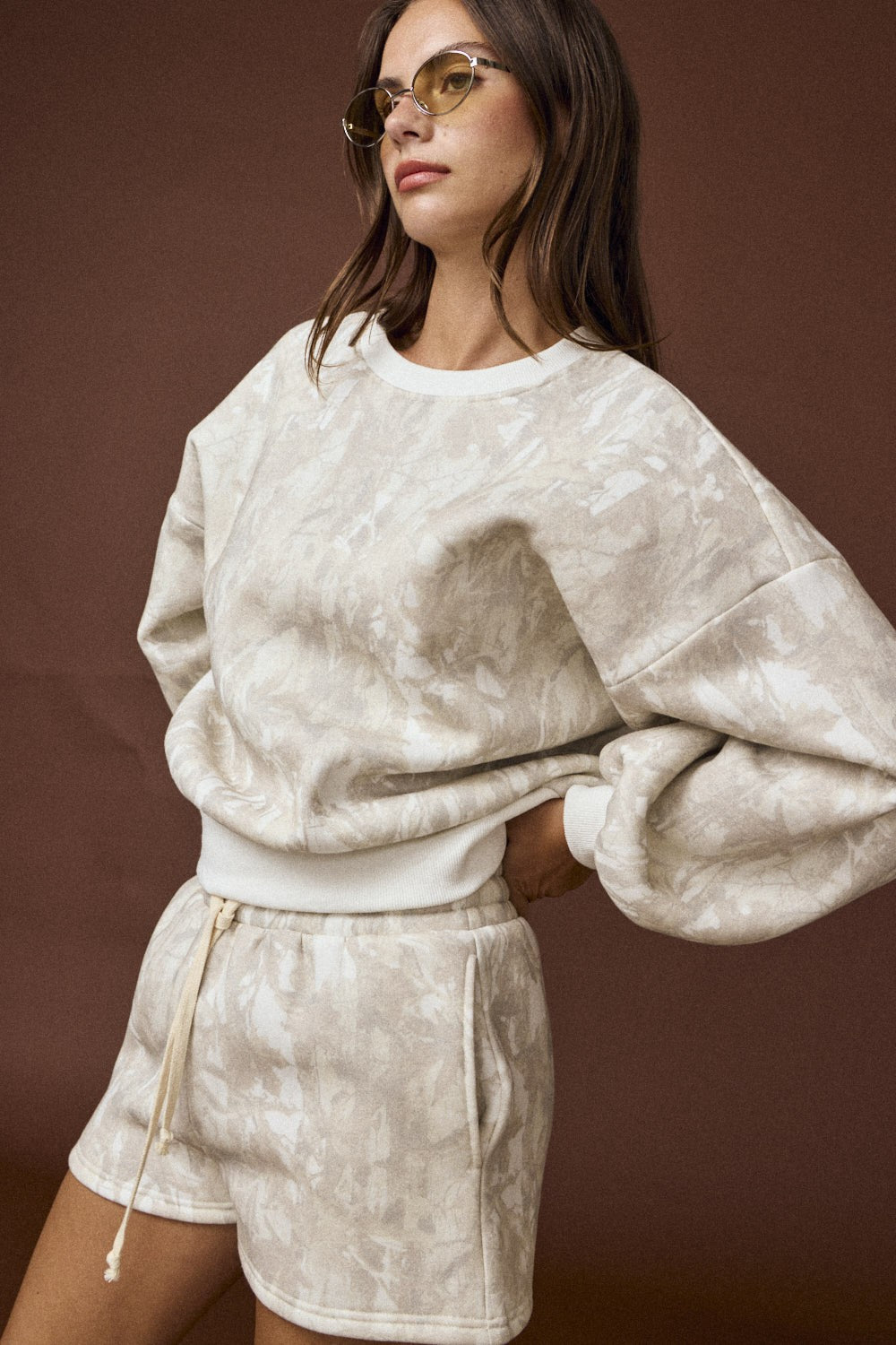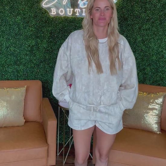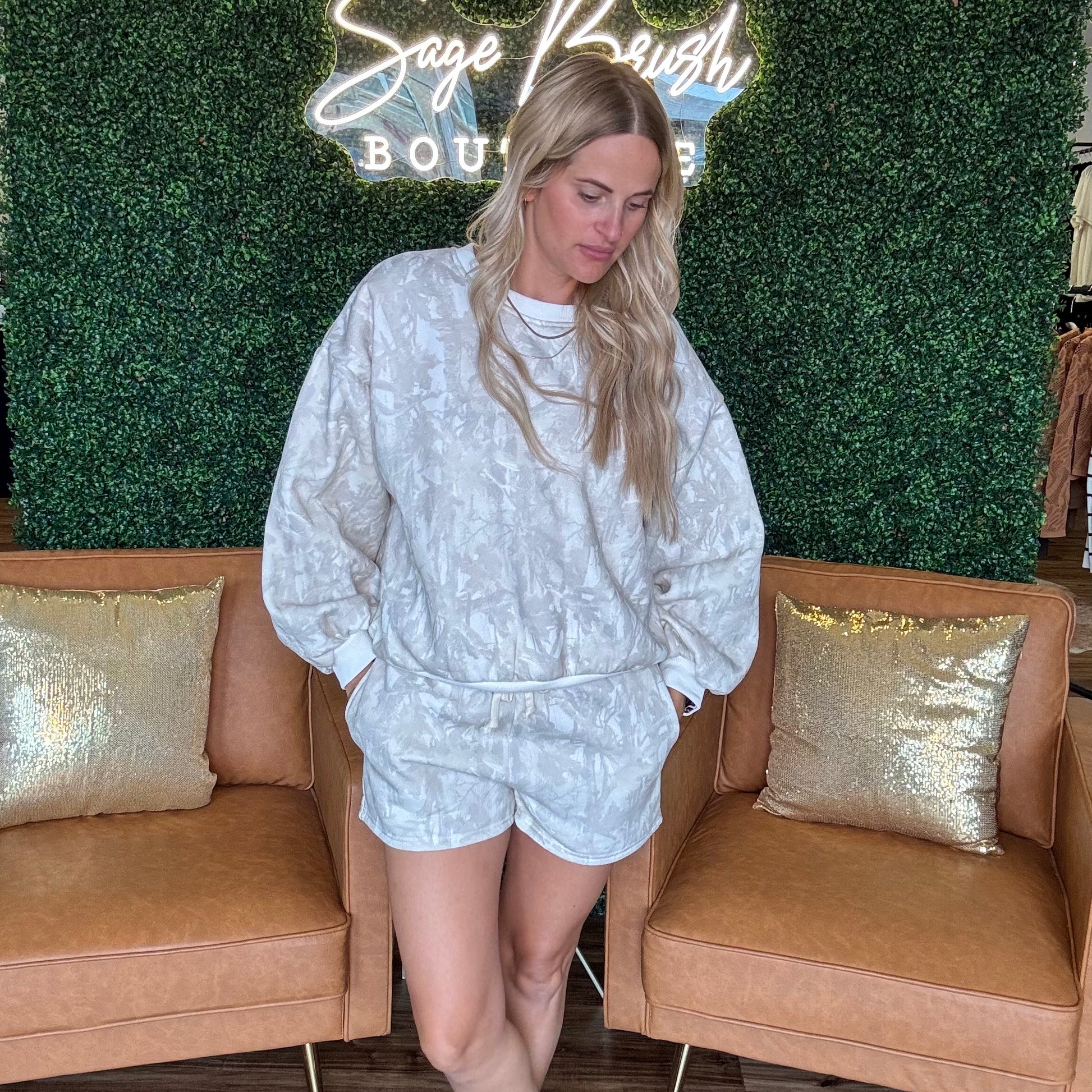 Enjoy the Woodland Camo Set featuring a cozy crewneck and matching shorts. This two-piece outfit boasts soft washed fabric with a subtle tie-dye effect. The oversized crewneck sweatshirt includes ribbed edges, while the high-waisted shorts come with a drawstring and handy side pockets. Perfect for laid-back days, travel adventures, or weekend chill sessions. Model's height is 5' 8" and wearing a size S